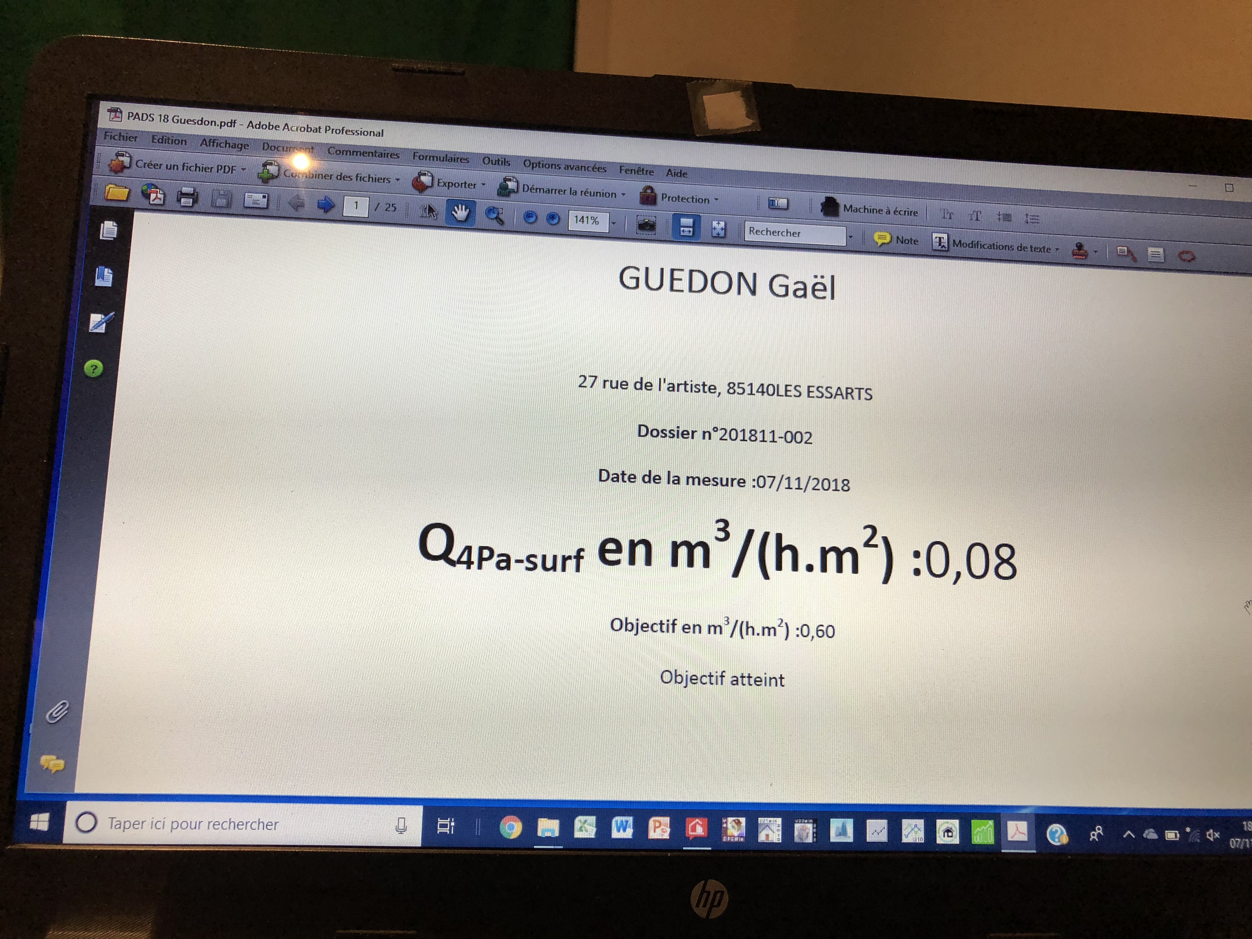 Mercredi 07 novembre 2018, la maison de M Guesdon a atteint une valeur de q4=0,08. La maison est bien étanche et une seule infiltration d’air a été détectée au niveau de la trappe d’accès aux combles. Aucune, aucune, aucune infiltrations d’air au niveaux des menuiseries, les appareillages électriques et les équipements de chauffage et plomberie n’a été détectée. Bravo Mr Guesdon et a toutes les entreprises intervenantes.